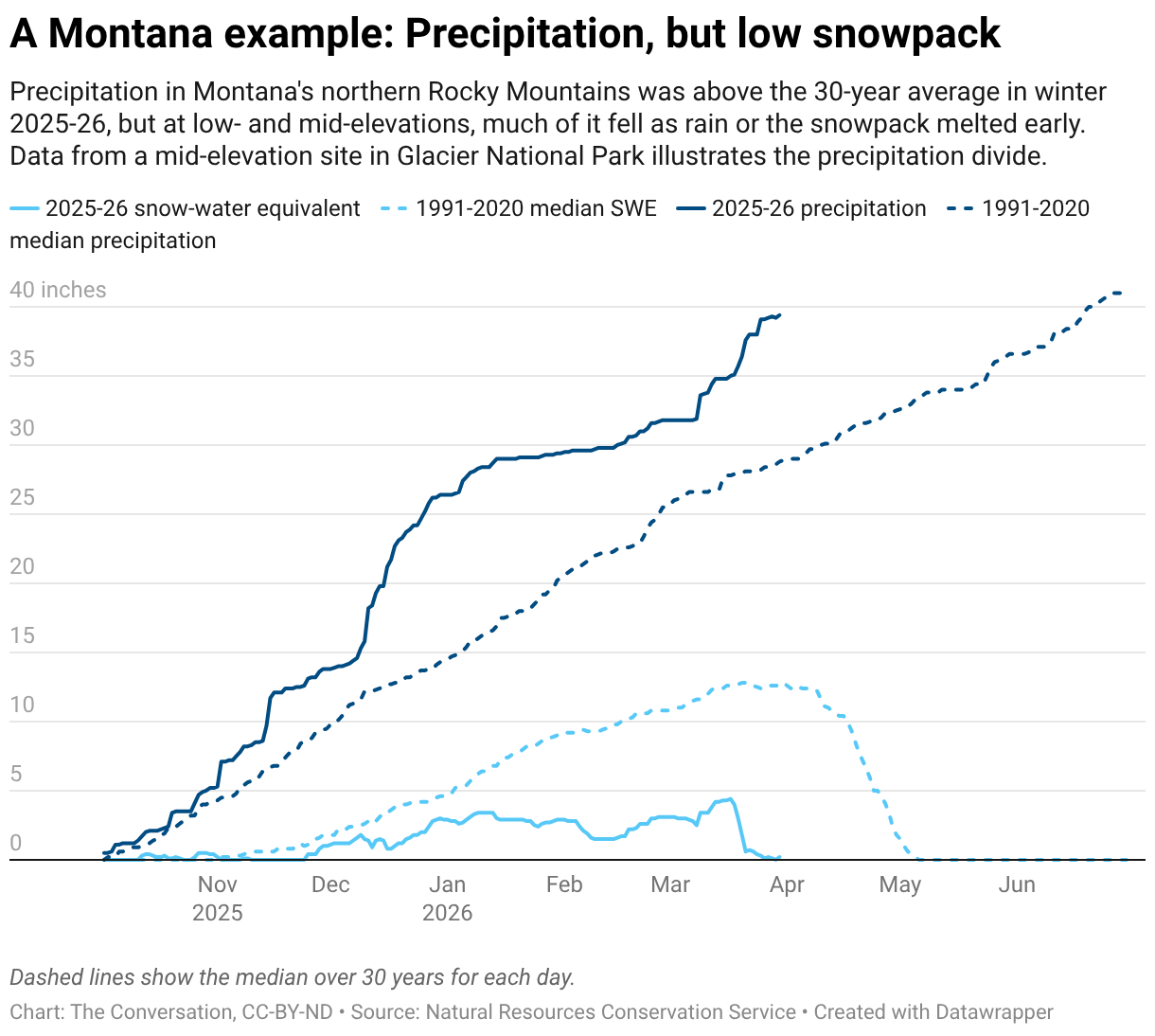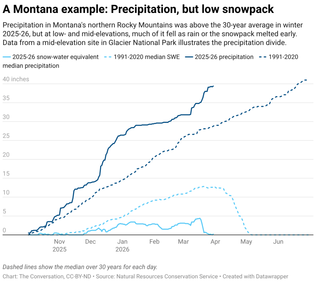 The exceptionally warm winter of 2025–26 across much of the western U.S. delivered a powerful preview of what the regional water cycle in a warmer climate may increasingly look like: less snow and a fundamental reshaping of the hydrograph – the chart of how much water flows through streams across the year.