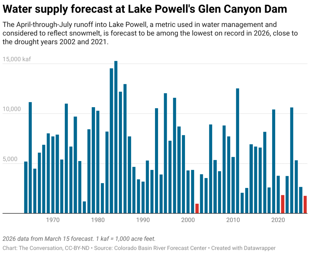 The April-through-July 2026 runoff into Lake Powell – the reservoir behind Glen Canyon Dam and the primary index of the Upper Colorado River Basin’s annual water budget – is currently forecast to rank among the lowest in recent decades. It has been tracking close to the grim years of 2002 and 2021, considered benchmarks of western drought.
