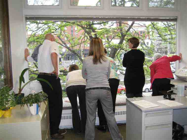 Tuesday morning, Michael watched the mother duck encourage her babies to the edge of the perch with the intent to show them how to jump off. Office work came to a standstill as everyone gathered to watch.