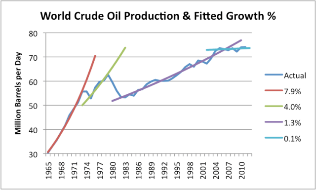 gt2 Figure 2. World crude oil production (including condensate) based primarily on US Energy Information Administration data, with trend lines fitted by the author.