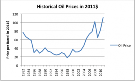 gt3 Figure 3. Historical average annual oil prices, (“Brent” or equivalent) in 2011$, from BP’s 2012 Statistical Review of World Energy.
