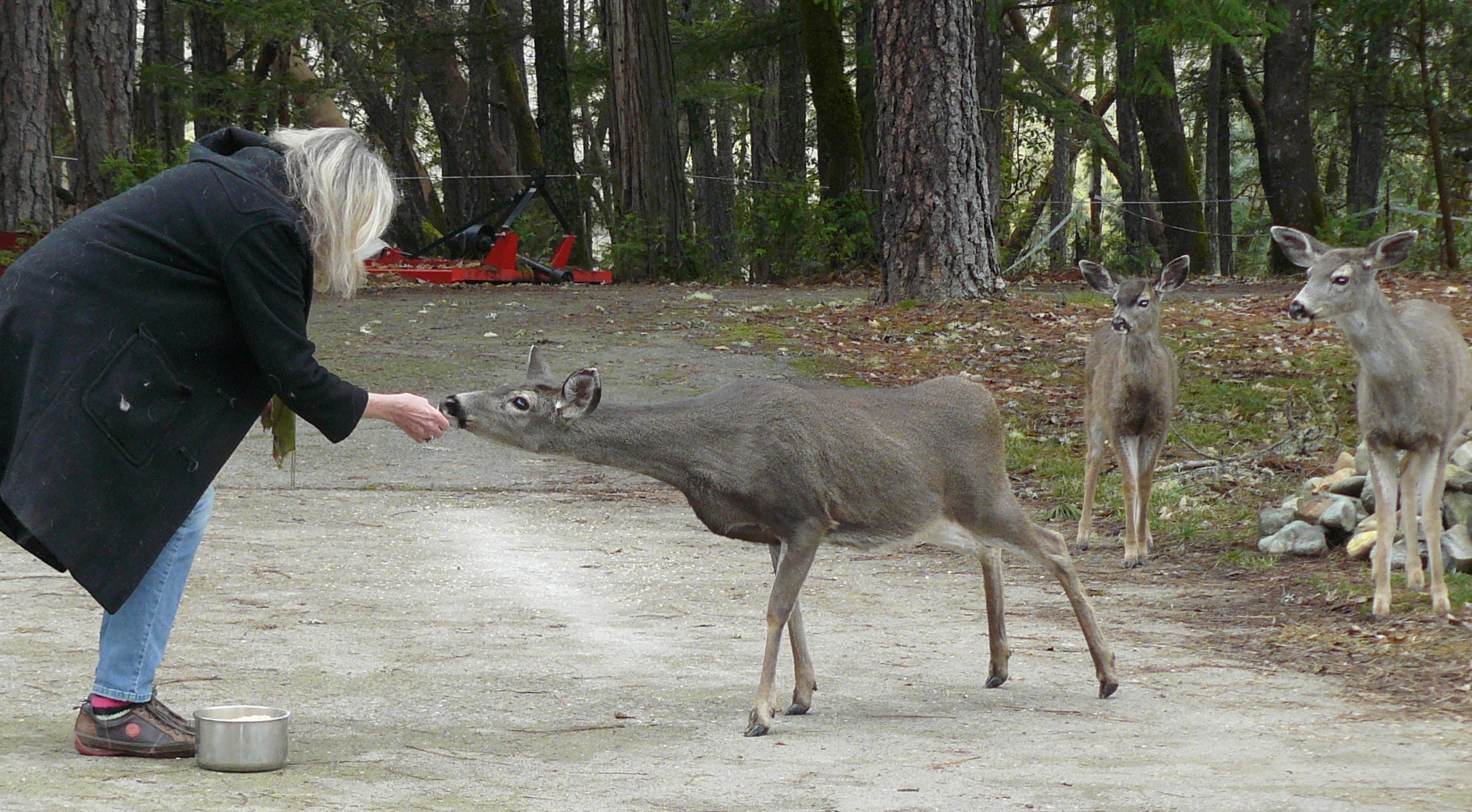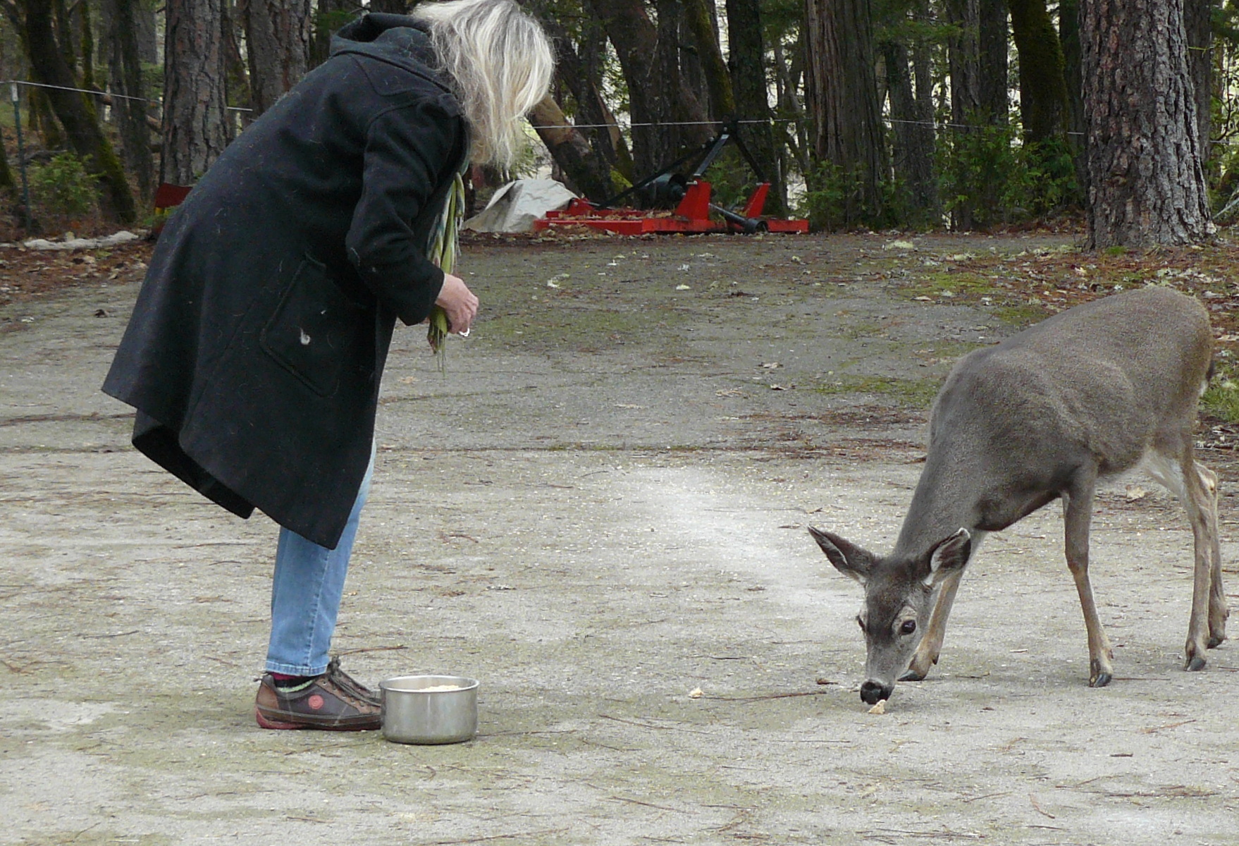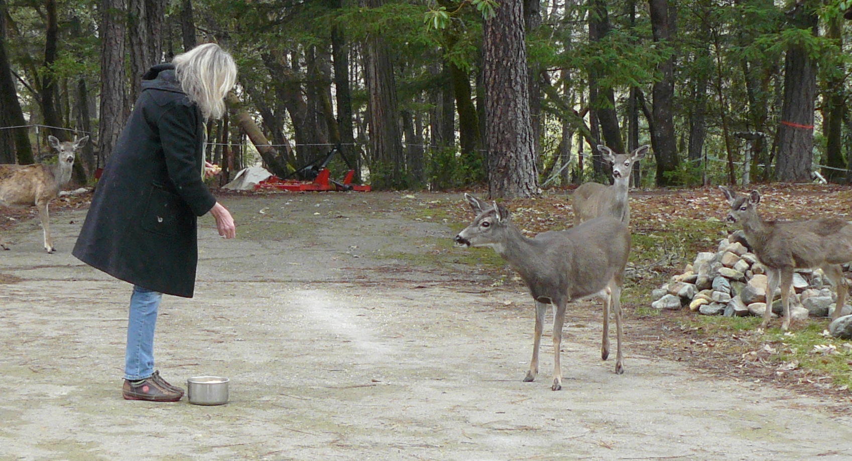 Now, some five weeks later, one of those deer has overcome fear to the point of taking a piece of bread from Jean’s hand. Here is the sequence of photographs taken last Saturday afternoon. N.B. We do not feed the deer bread as a routine; it’s not good for them.