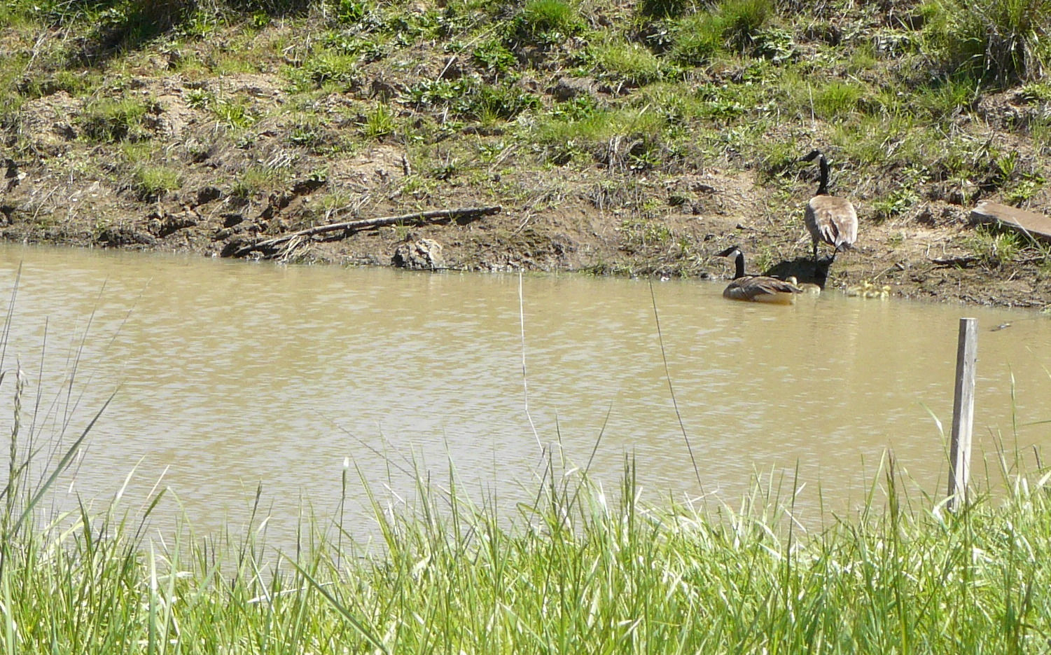 But this pair first started egg-sitting far too long ago for what we believed was the normal incubation period for Canada Geese; 24 to 28 days. Plus, neighbours Larry and Janell, had seen broken gosling eggs just inside their fence line. We held our breath as we looked around the pond.