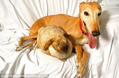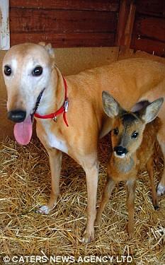 Jasmine, however, had other ideas. No one quite remembers how it came about, but Jasmine started welcoming all animal arrivals at the sanctuary. It would not matter if it were a puppy, a fox cub, a rabbit or, any other lost or hurting animal. Jasmine would just peer into the box or cage and, when and where possible, deliver a welcoming lick. MD2 Geoff relates one of the early incidents. “We had two puppies that had been abandoned by a nearby railway line. One was a Lakeland Terrier cross and another was a Jack Russell Doberman cross. They were tiny when they arrived at the centre, and Jasmine approached them and grabbed one by the scruff of the neck in her mouth and put him on the settee. Then she fetched the other one and sat down with them, cuddling them.” “But she is like that with all of our animals, even the rabbits. She takes all the stress out of them, and it helps them to not only feel close to her, but to settle into their new surroundings. She has done the same with the fox and badger cubs, she licks the rabbits and guinea pigs, and even lets the birds perch on the bridge of her nose.MD3 Jasmine, the timid, abused, deserted waif, became the animal sanctuary’s resident surrogate mother, a role for which she might have been born. The list of orphaned and abandoned youngsters she has cared for comprises five fox cubs, four badger cubs, fifteen chicks, eight guinea pigs, two stray puppies and fifteen rabbits – and one roe deer fawn. Tiny Bramble, eleven weeks old, was found semi-conscious in a field. Upon arrival at the sanctuary, Jasmine cuddled up to her to keep her warm, and then went into the full foster-mum role. Jasmine the greyhound showers Bramble the roe deer with affection, and makes sure nothing is matted. MD4They are inseparable,” says Geoff. “Bramble walks between her legs, and they keep kissing each other. They walk together round the sanctuary. It’s a real treat to see them.MD5 Jasmine will continue to care for Bramble until she is old enough to be returned to woodland life. When that happens, Jasmine will not be lonely. She will be too busy showering love and affection on the next orphan or victim of abuse. MD6 Pictured left to right are: “Toby”, a stray Lakeland dog; “Bramble”, orphaned roe deer; “Buster”, a stray Jack Russell; a dumped rabbit; “Sky”, an injured barn owl; and “Jasmine”. All told a mother’s heart doing best what a caring mother does.