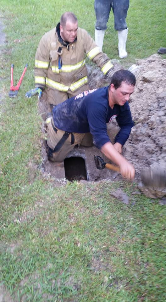 Gulfport Fire Department Battalion Chief Chris Henderson, along with seven other firefighters and a pair of workers from the public works department, began working together to extricate the dog.