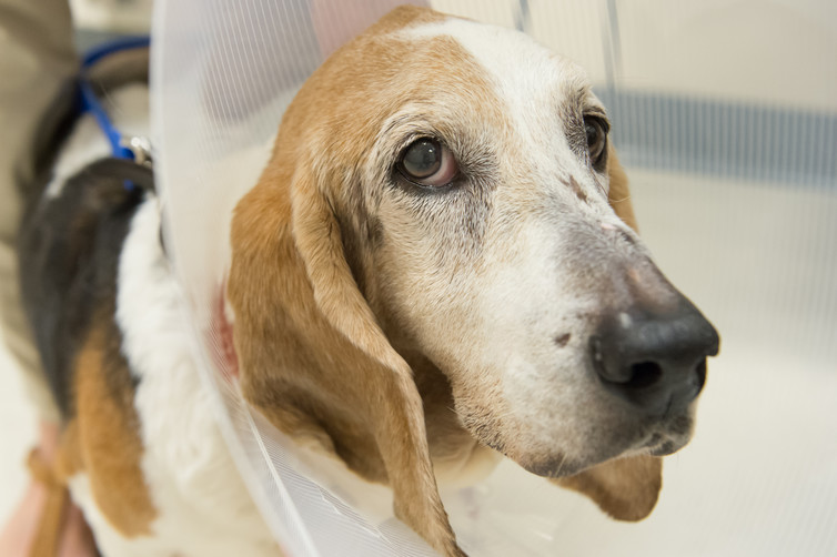 The author, center, and Dr. Anna Conti, left, and student Kelsey Parrish with Conti’s Basset hound, Picasso, who had surgery for cancer. Via Colorado State University. William Cotton/CSU Photography, Author provided
