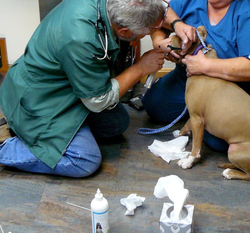 This was Millie, a pit mix, who had been dropped off at the Clinic earlier on. Millie’s owner said that there appeared to be something troubling Millie’s ears. Millie was, indeed, shaking her head a great deal.