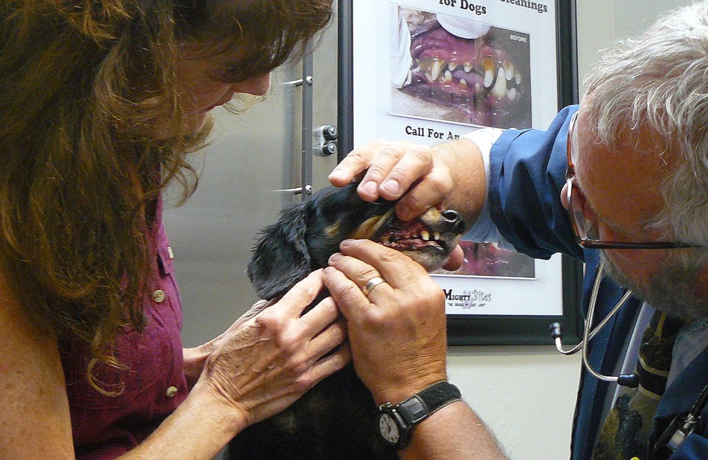 Jim examined Jefferson. First examining the dog’s lymph node and then listening to either side of the dog’s chest.