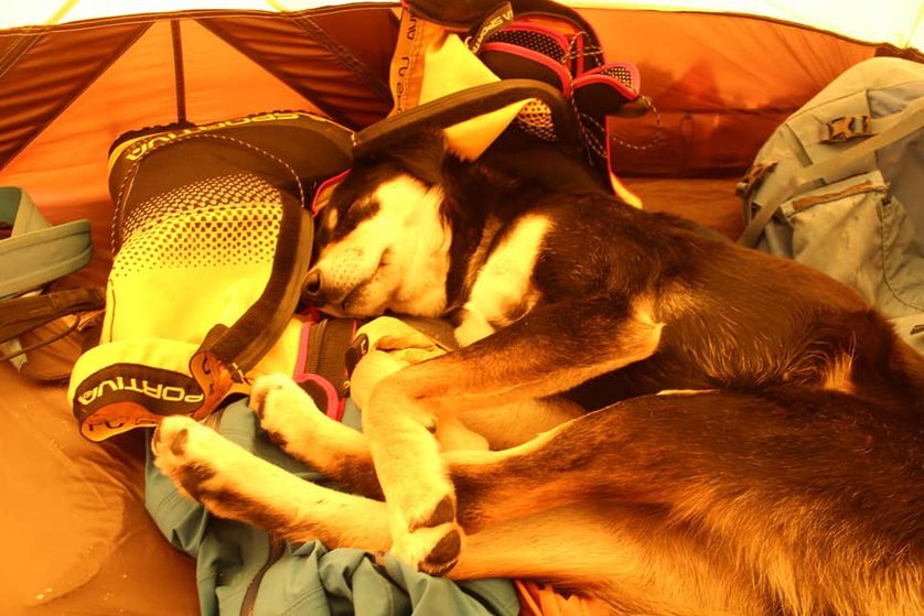 Early on, Mera started to slide and Wargowsky was able to catch her and save her from what could’ve been a dangerous fall. When the team moved to camp two at around 21,000 feet, they were sidelined there for four days because of bad weather. Mera stayed with Wargowsky, who shared his tent and his food with the pup.