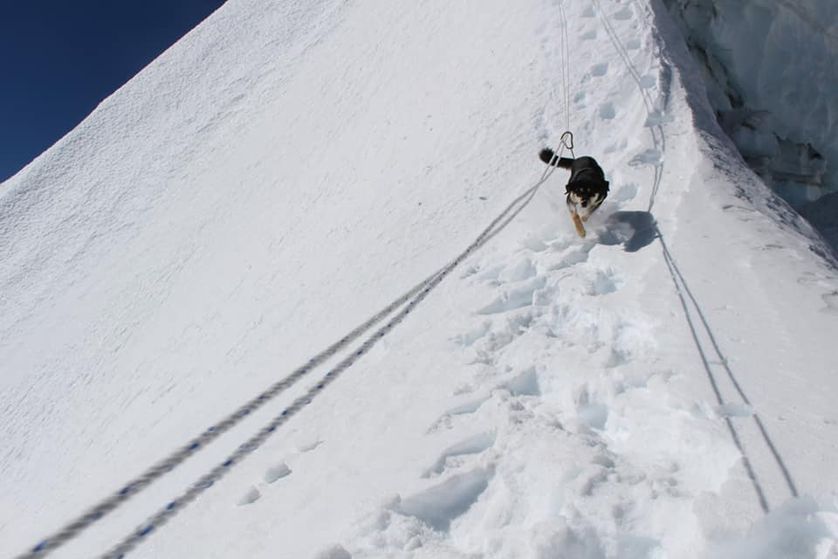 The climbers had just summited Mera Peak, and when they were coming down around Mera La pass, they saw the pup going up.
