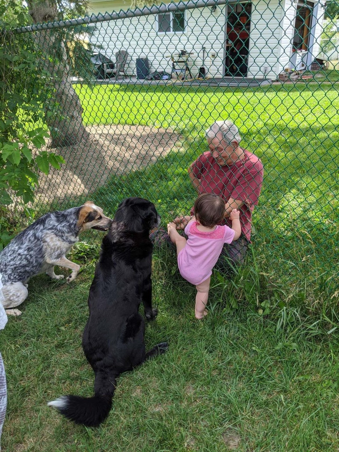 As soon as Ramona was able to eat solid foods, the neighbor offered her a freshly baked oatmeal cookie and Ramona quickly realized how good her dog brothers had it. “Now that she’s walking and mobile she just trots on over to the fence to line up with the dogs so she can get her ‘treats’ too,” Whalley said.