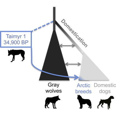 The origin of domestic dogs is poorly understood [ 1–15 ], with suggested evidence of dog-like features in fossils that predate the Last Glacial Maximum [ 6, 9, 10, 14, 16 ] conflicting with genetic estimates of a more recent divergence between dogs and worldwide wolf populations [ 13, 15, 17–19 ]. Here, we present a draft genome sequence from a 35,000-year-old wolf from the Taimyr Peninsula in northern Siberia. We find that this individual belonged to a population that diverged from the common ancestor of present-day wolves and dogs very close in time to the appearance of the domestic dog lineage. We use the directly dated ancient wolf genome to recalibrate the molecular timescale of wolves and dogs and find that the mutation rate is substantially slower than assumed by most previous studies, suggesting that the ancestors of dogs were separated from present-day wolves before the Last Glacial Maximum. We also find evidence of introgression from the archaic Taimyr wolf lineage into present-day dog breeds from northeast Siberia and Greenland, contributing between 1.4% and 27.3% of their ancestry. This demonstrates that the ancestry of present-day dogs is derived from multiple regional wolf populations.