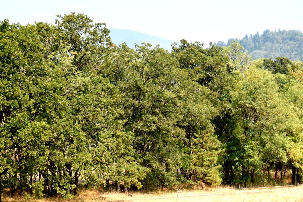 Now in stark contrast look at the trees in the photo below. (Oh, that’s the smoky summit of Mount Sexton, elevation 3,829 ft., in the distance.)