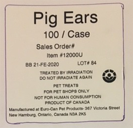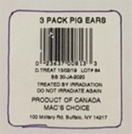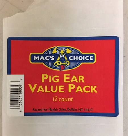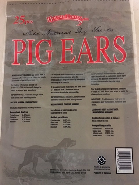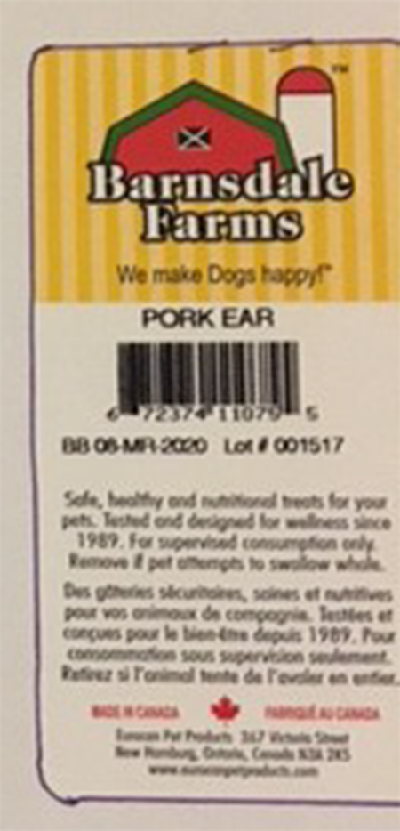 March 20, 2017 — EuroCan Manufacturing is voluntarily recalling one lot of its Barnsdale Farms, HoundsTooth and Mac’s Choice pig ears because they have the potential to be contaminated with Salmonella.