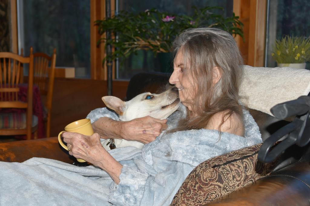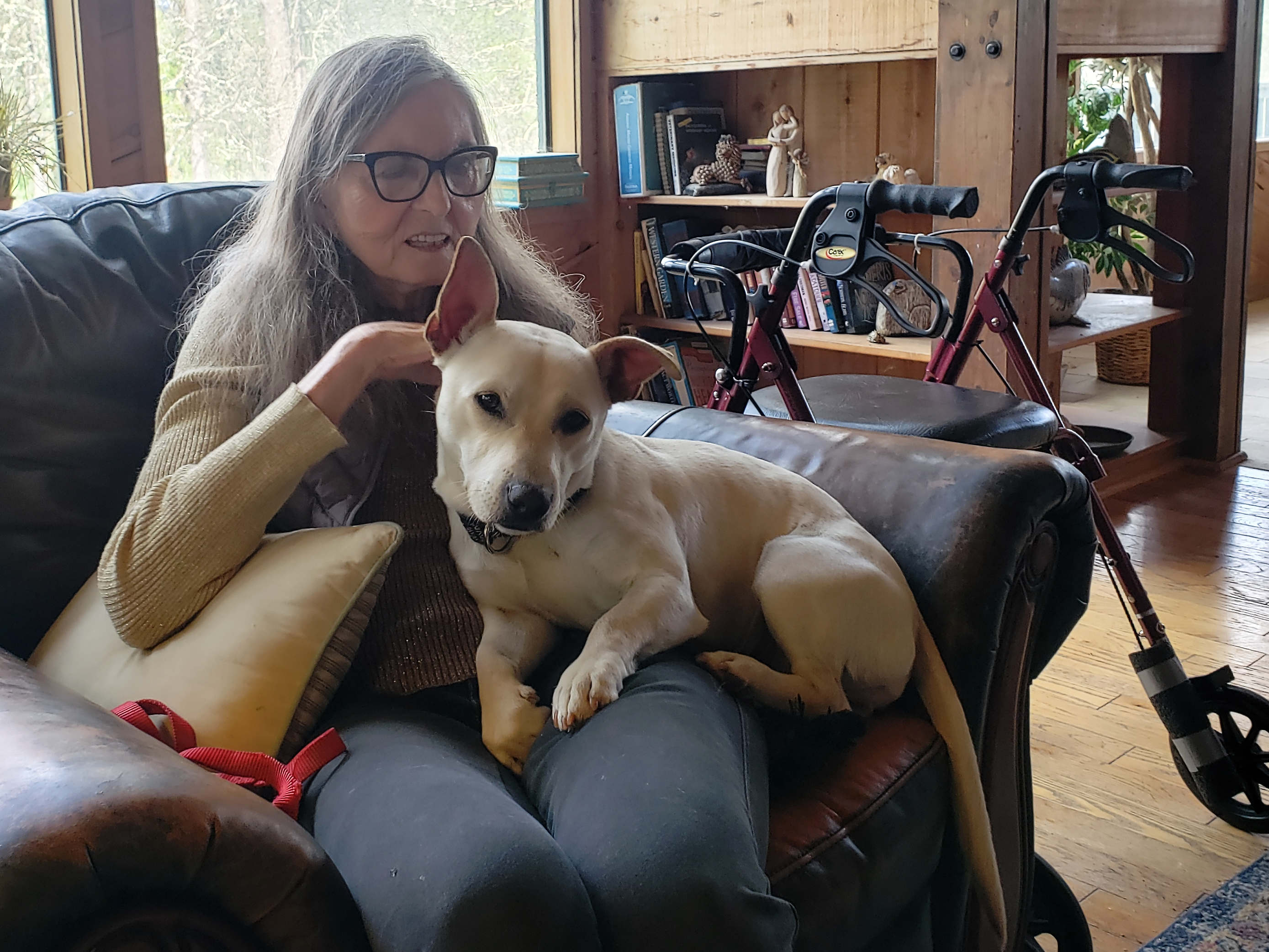 Cloudy is from the local Josephine County Animal Shelter. After Cleo died we felt (including Oliver) that just one dog at home was too hard on everyone.