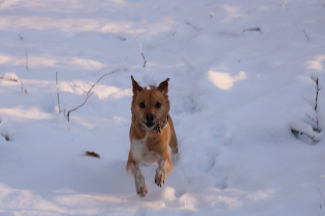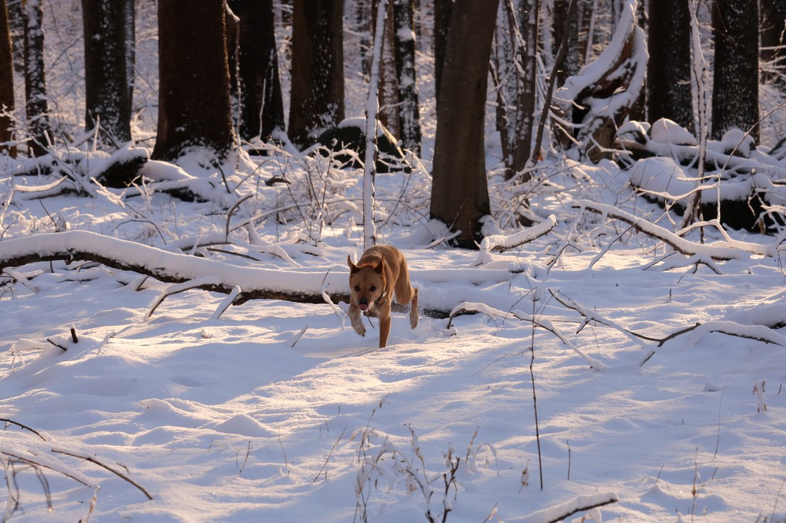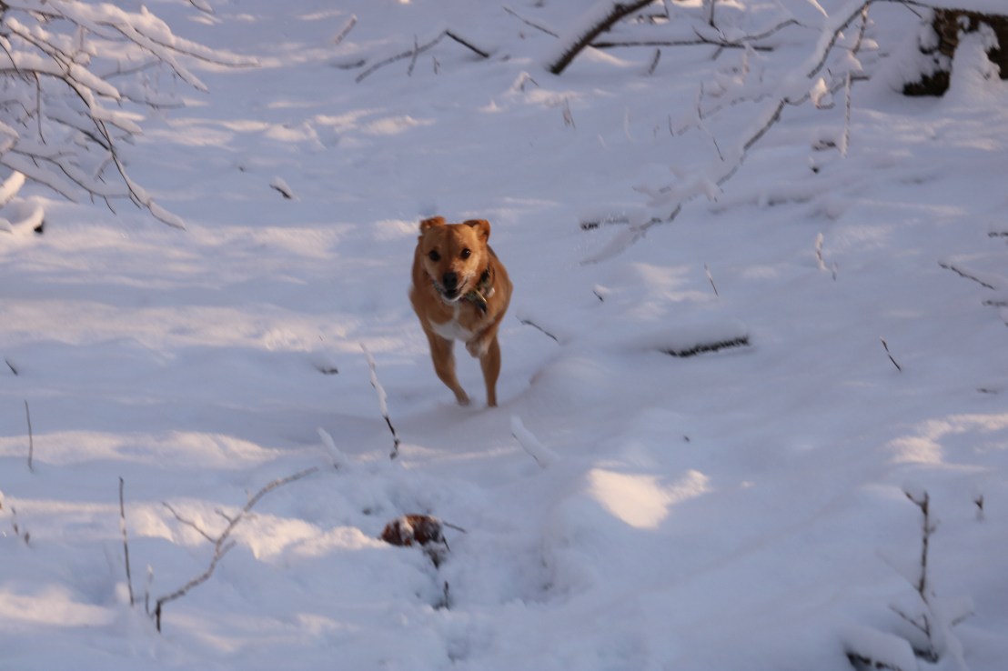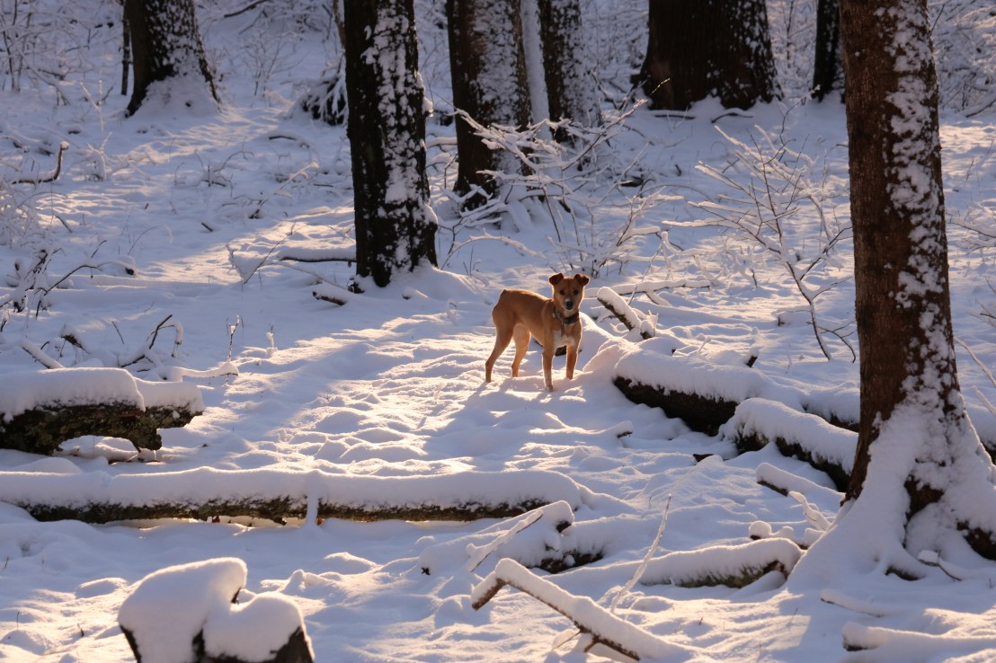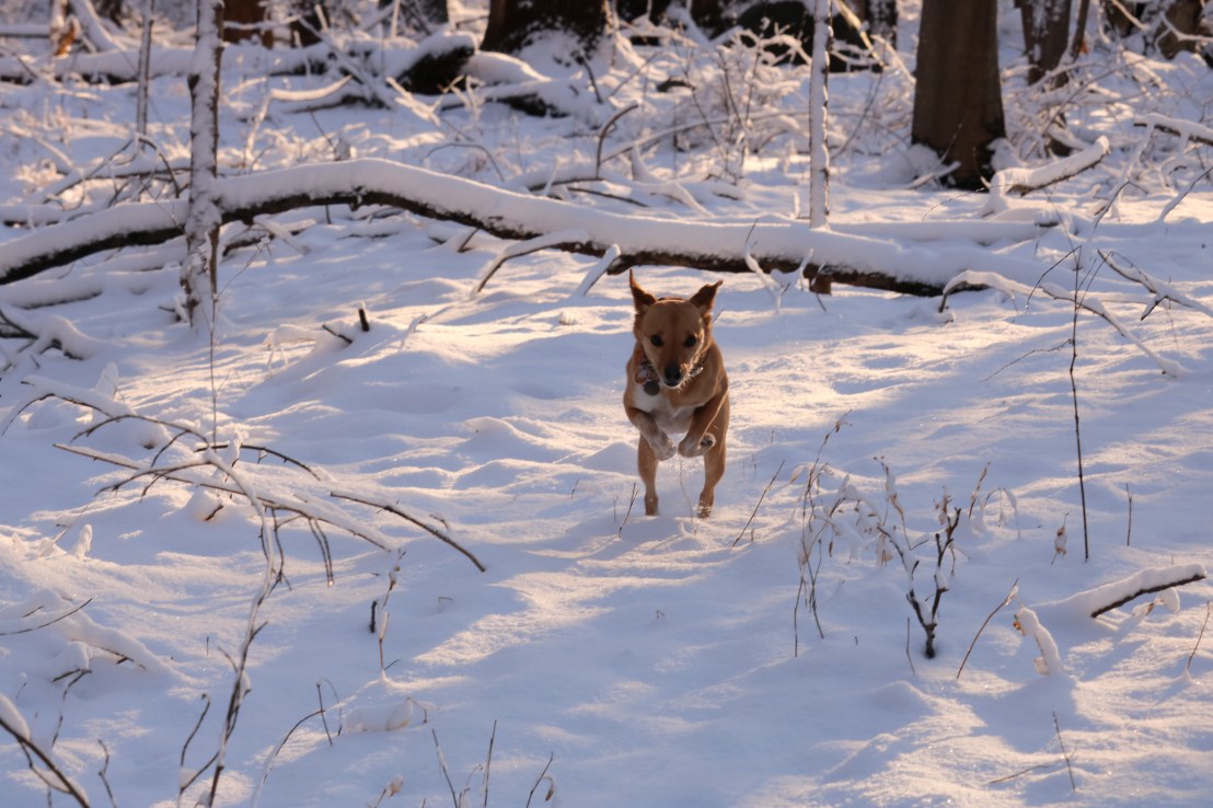 We went for a walk in the woods behind our house this afternoon. We got about 3 inches of snow that stuck to the trees. Norah loves to run in the new snow!