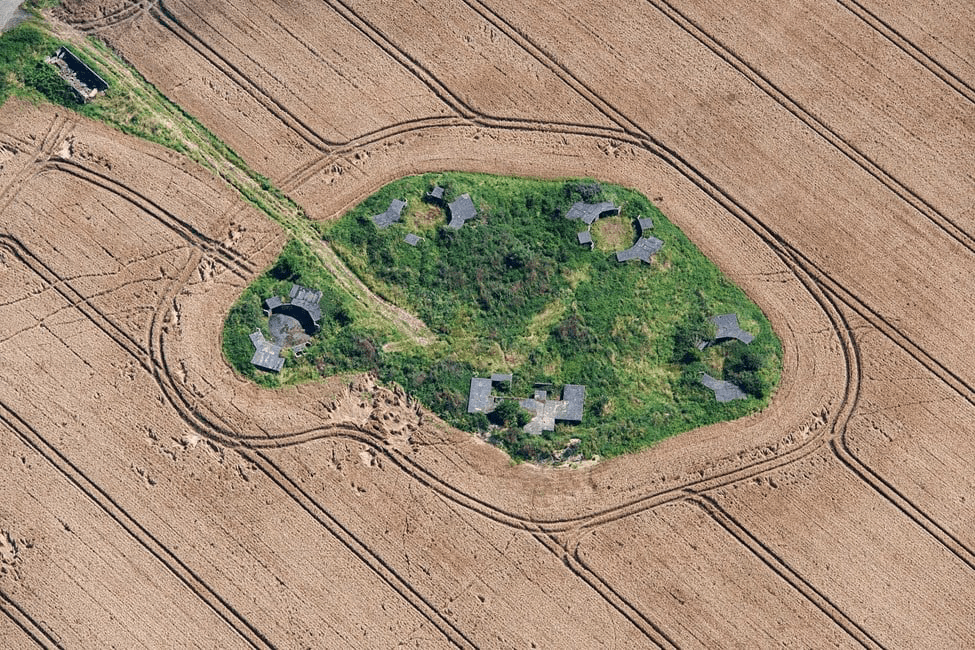 The late 1990s saw RCHME and EH working together to supply aerial photographs to help Field Monument Wardens monitor the condition of scheduled monuments. Following the merger of the two organisations in 1999 this became an important aspect of the flying programme. In the image below the World War Two anti-aircraft battery might appear to be safe since it has been removed from the cultivation that surrounds it. However, it is still at risk from being overgrown by scrub.