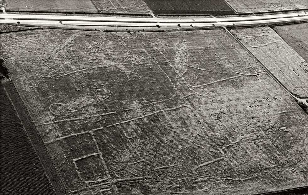 At about the same time as this first flight the collection of aerial photographs grew with the arrival of the Crawford Collection from the Ordnance Survey. Later, in the 1970s, the Air Photo library acquired many more aerial photographs from archaeologists and private fliers keen to discover archaeological sites. One such flier was Derrick Riley who took this photograph of an Iron Age/Roman field system in Nottinghamshire.