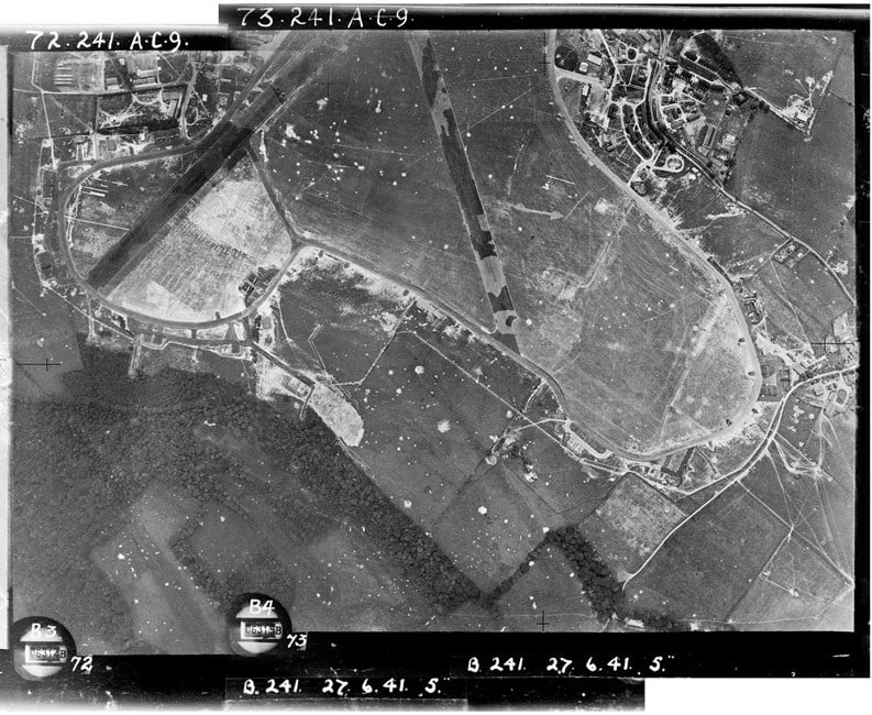 Photo mosaic of RAF images of Biggin Hill airfield taken on 27 June 1941, showing a camouflaged runway and filled in bomb craters (RAF_241_72 and 73). Source: Historic England Archive (RAF collection).