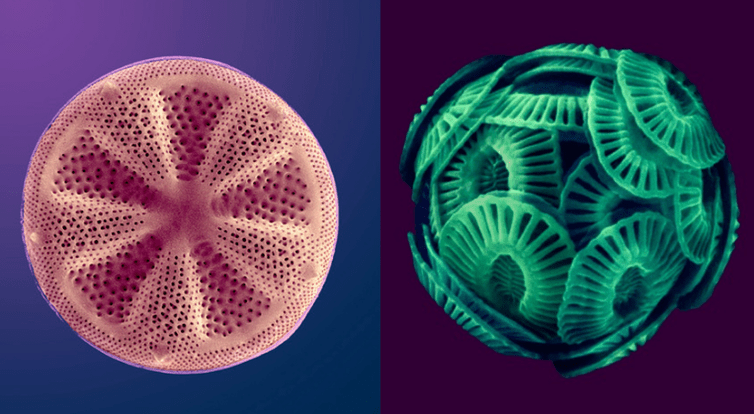 Enhanced scanning electron microscope images of phytoplankton (left, a diatom; right, a coccolithophore). Different phytoplankton species have distinct climatic preferences, which makes them ideal indicators of surface ocean conditions. Dee Breger, CC BY-NC-ND