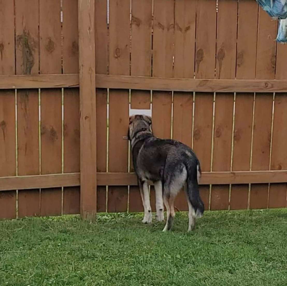 A few months after he was adopted last year, Burger started digging under his family’s fence. He wanted to be able to watch all the people going by, and after thinking about it for a while, his dad came up with the best idea.