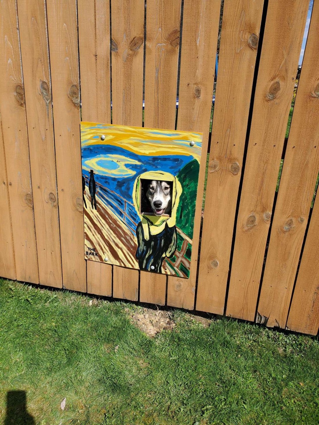 With the idea cemented in their minds, Stanley and his 7-year-old son Cameron got to work on their first painting. They decided to create a version of the famous painting “The Scream” and call it “The Bark.” They hung up the painting and admired their work. They hadn’t been planning on making any more paintings, but after the first one, the ideas just kept coming — and now the artwork framing Burger’s window is constantly changing.