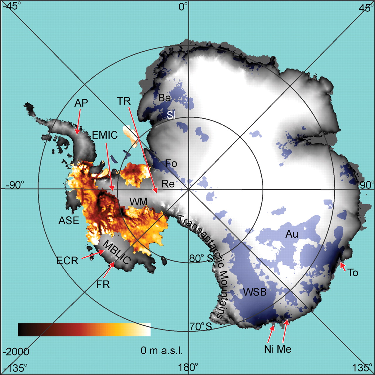 AP, Antarctic Peninsula; EMIC, Ellsworth Mountain Ice Cap; ECR, Executive Committee Range; MBLIC, Marie Byrd Land Ice Cap; WM, Whitmoor Mountains; TR, Thiel Range; Ba, Bailey Glacier; SL, Slessor Ice Stream; Fo, Foundation Ice Stream; Re, Recovery Glacier; To, Totten Glacier; Au, AURORA BASIN; Me, Mertz Glacier; Ni, Ninnis Glacier; WSB, WILKES SUBGLACIAL BASIN; FR, Flood Range; a.s.l., above sea level.