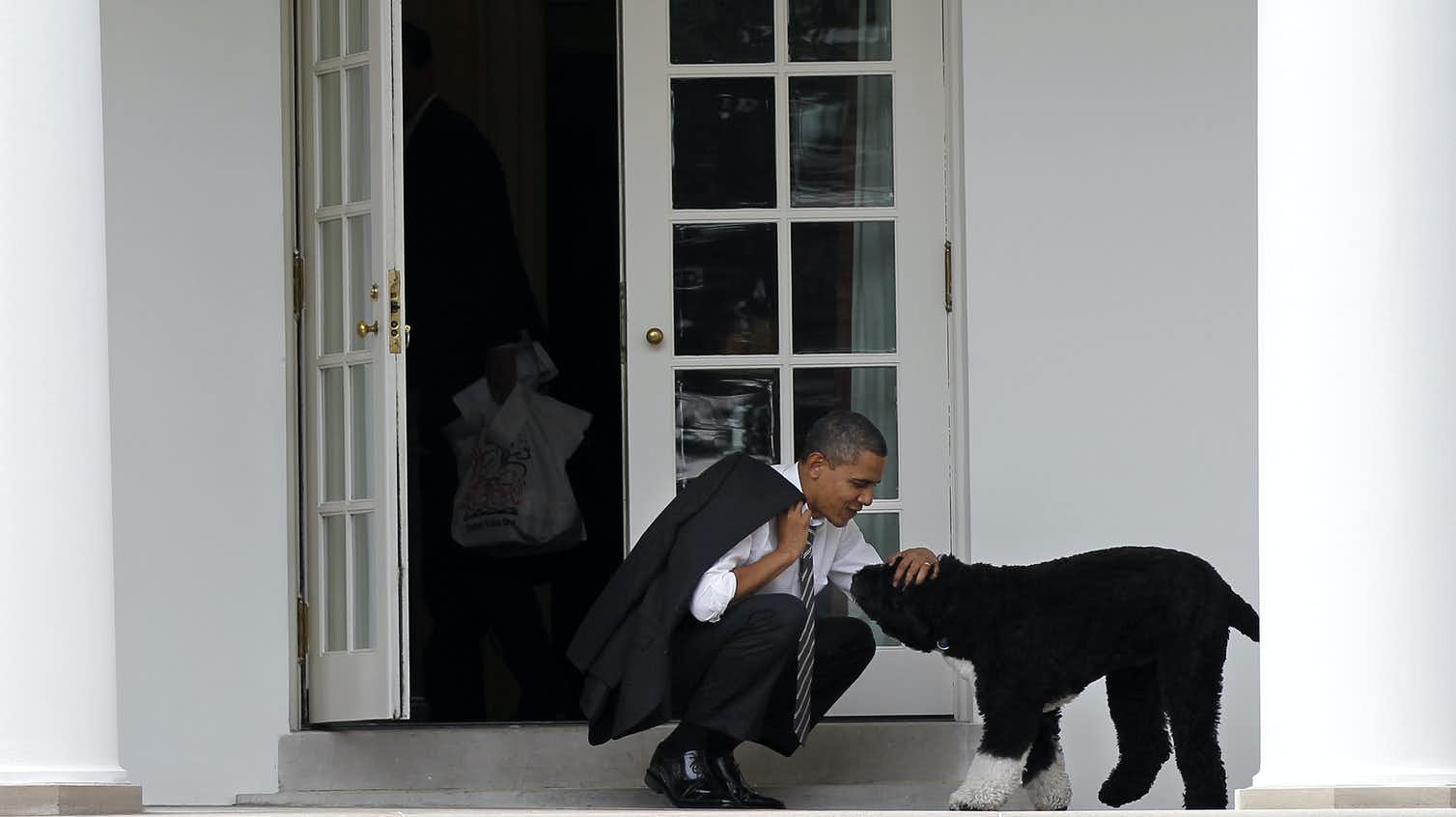 President Barack Obama takes a break outside the Oval Office with Bo in 2012. AP Photo/Pablo Martinez Monsivais