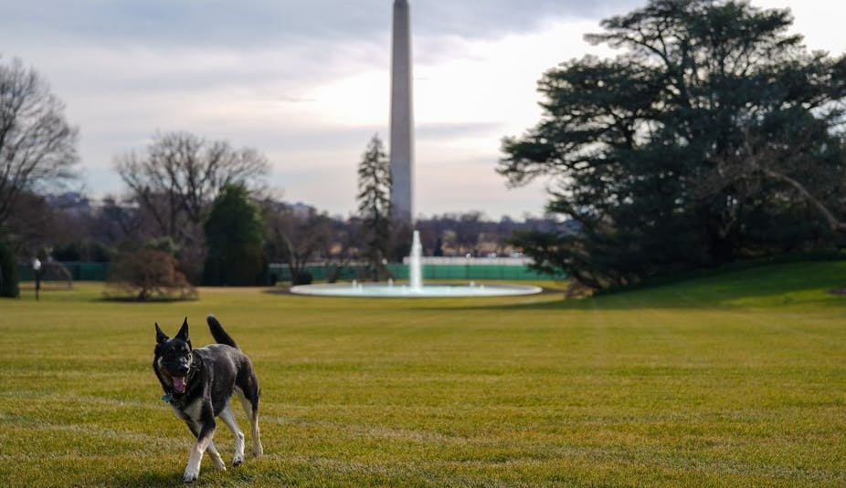 Presidential pup Major Biden stretches his legs on the White House lawn. The Official White House photo/Adam Schultz via Twitter, CC BY