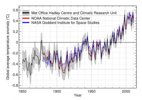 Global average temperatures from 1850 to 2011 from the three individual global temperature datasets (Met Office/UEA HadCRUT3, NASA GISS and NOAA NCDC)