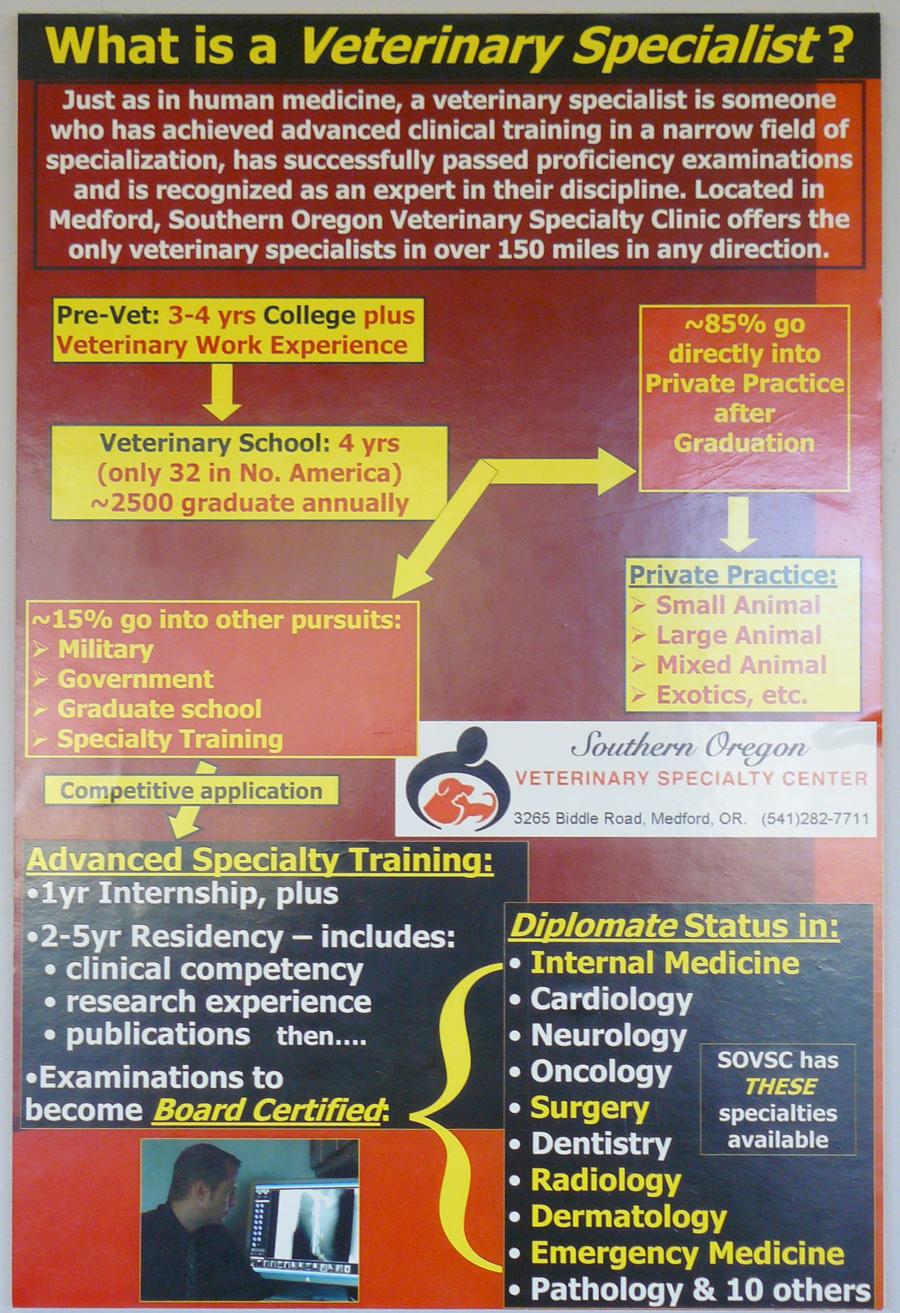 At Southern Oregon Veterinary Specialty Center, we understand the special bond between a pet and their human family. Our team of highly trained doctors, certified technicians and support staff partner with your family veterinarian to provide specialized diagnostics, surgery and emergency care for your pet upon a referral or emergency basis. Our clinic is staffed 24 hours-a-day, 7 days a week, to receive emergency cases and to monitor our critical care patients. The clinic’s board-certified veterinary specialists and staff are committed to providing exceptional compassionate care utilizing state-of-the-art technology and treatments.