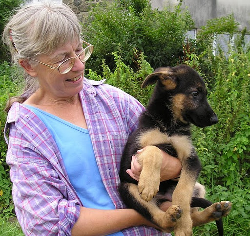 Here’s Pharaoh the day I collected him from GSD breeders Jutone‘s in Dartmoor, SW England. That’s Sandra Tucker, the owner of Jutone, with Pharaoh; the date being 12th August 2003 when Pharaoh was then just over 8 weeks old.