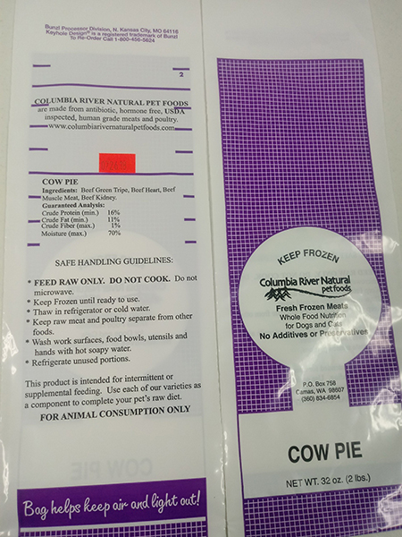 The potential for contamination was noted after testing by the Washington State Department of Agriculture revealed the presence of Listeria monocytogenes and Salmonella in one package of Cow Pie and Salmonella in one package of Chicken & Vegetables.