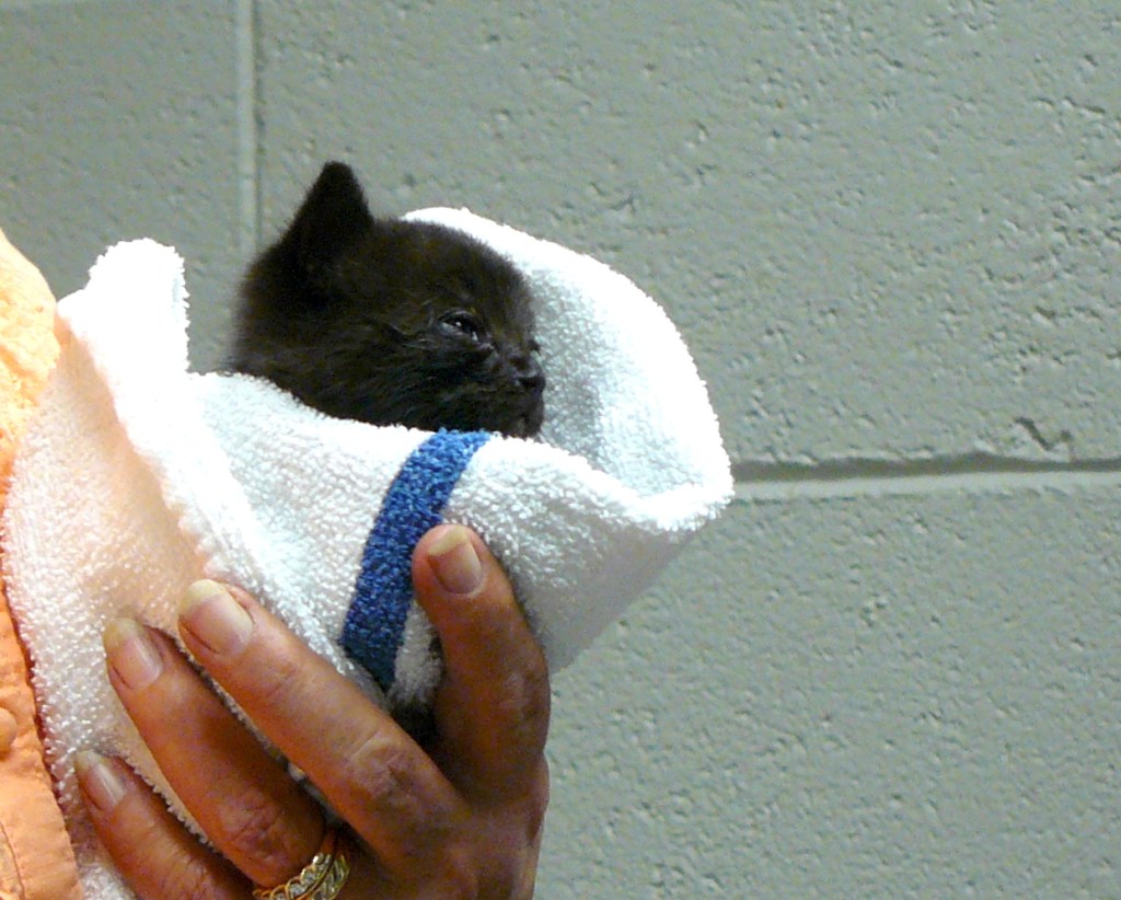 12:30 All done. Lynn wraps the kitten back into the same towel that was used to bring it in to the clinic such a short time ago.