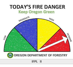 It is yet another dry, hot day in a long run of hot, dry days. Our local online weather service, GrantsPassWeather.com, informs me that the temperature this afternoon (i.e. yesterday) is forecast to be a high of 93 deg F. or 34 deg C. We last had monthly rain totals of more than an inch back in March. At the top of the home page of Grants Pass Weather is a bold red banner proclaiming a Red Flag Warning for three counties: Jackson, Josephine and Eastern Curry. We live in Josephine County and clicking that banner reveals: