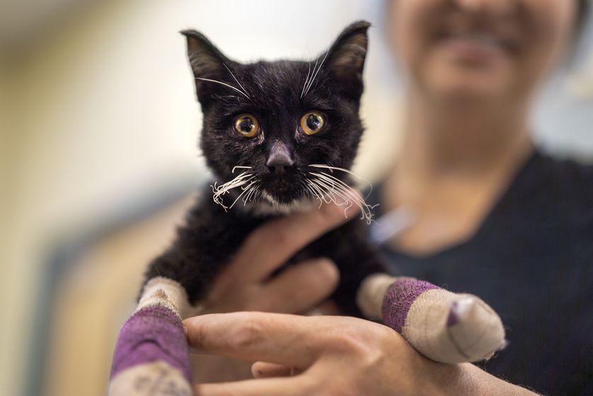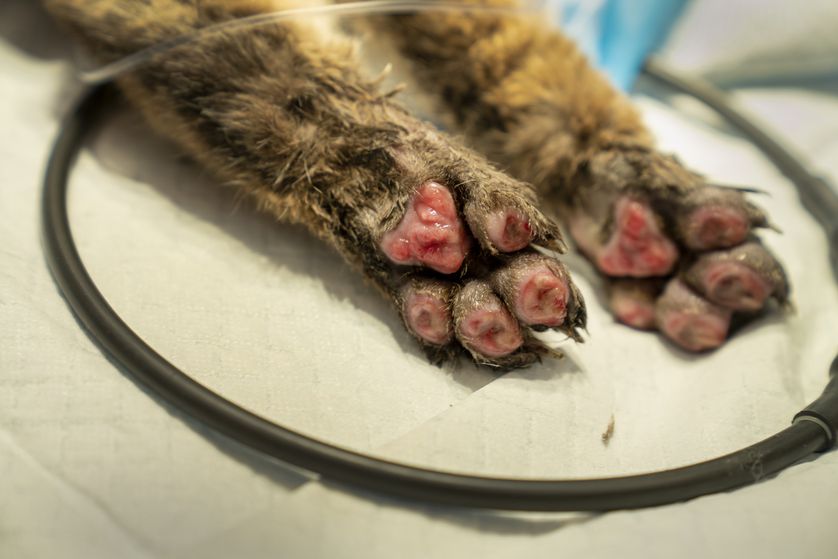 “Their paws have been badly burned,” said Dusty Spencer, a veterinary surgeon at VCA Valley Oak Veterinary Center. “Their whiskers are singed or gone. Some of them have had really bad burns on their eyelids and nose.”