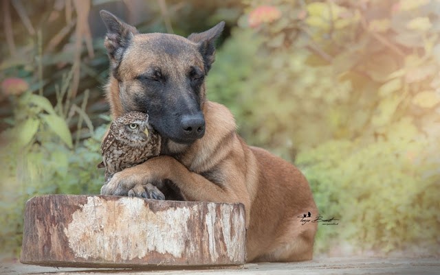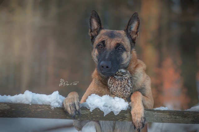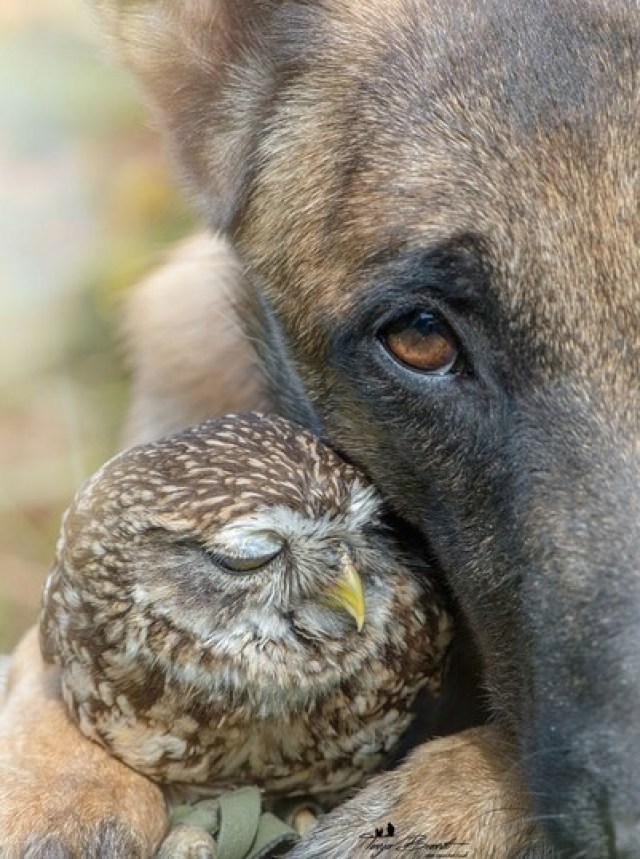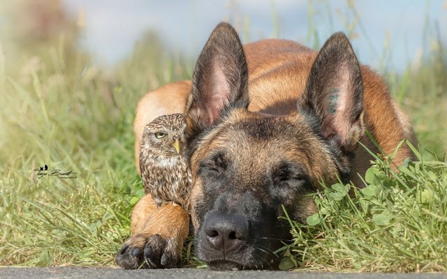 Recently, the German artist found a new challenge when she photographed the unique bond between two unlikely friends: Ingo, a Belgian Shepherd, and Poldi (Napoleon), a one-year-old owlet.