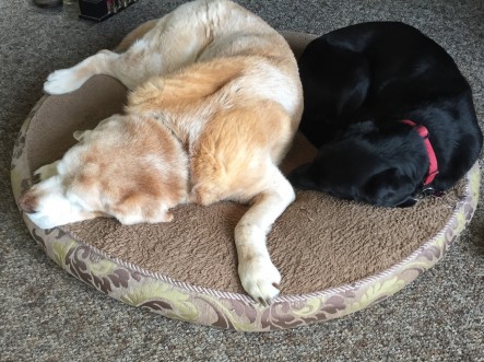 Even though I have two Labrador Retrievers, Sanchez no longer retrieves. He’s 13 1/2 and he’d prefer to lay on his dog bed and have me bring him his toy. However, I want to engage him when I play a fun game of retrieve with Gina. So, I toss her ball down the stairs. She retrieves it and while she’s running up the stairs to bring me back the ball for the next round, I toss treats to Sanchez down the stairs. He uses his nose to find them. Fun for all! We generally do this nightly, no matter the weather.