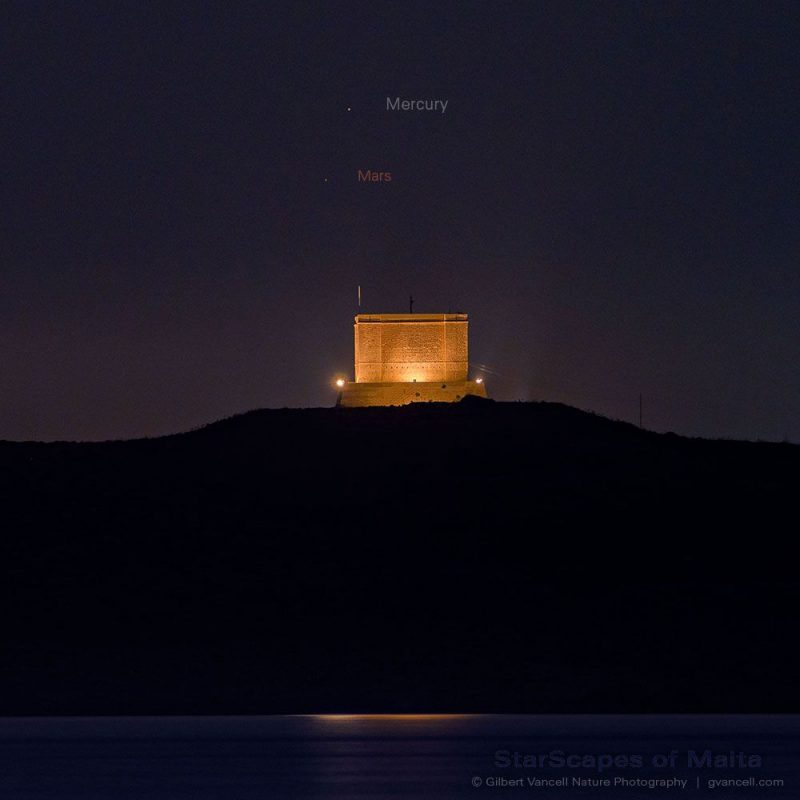 Dr Ski in Valencia, Philippines, caught Mars and Mercury on the day following their conjunction, June 19, 2019. The nearby stars Castor and Pollux in the constellation Gemini are a great comparison. Those 2 stars are noticeable for being bright and close together. Mercury and Mars were much closer! Thanks, Dr Ski!Wow! You can really see the color difference between red Mars (on the left) and Mercury in this photo from the day of the conjunction – June 18, 2019 – by Peter Lowenstein in Mutare, Zimbabwe. Thanks, Peter!Here’s a June 17 photo from Jose Lagos in Vaals, Netherlands. He wrote, “This was the last image I could get before June 18, when it was too cloudy near the horizon, but you can see that the conjunction is nearly perfected. It was beautiful to behold even this much of it. Thank you for your time and your great work at Earth Sky.” Thank you for your photo and kind words, Jose!Gilbert Vancell caught the planets on June 18, too, and wrote: “Mercury (top) and Mars setting behind Comino Tower. Shot from Armier, Malta.”Helio C. Vital captured in Rio de Janeiro, Brazil, on June 18, 2019. He wrote, “Despite the fact that many clouds were floating over my western horizon this evening, I could get some photos of Mercury and Mars only 14 arcminutes apart over Rio de Janeiro at dusk (from 17:45 to 18:30 UTC-3h, June 18, 2019).Forming a beautiful close pair through binoculars, Mercury was an easy naked-eye target while Mars (4.4 times dimmer) required the use of averted vision to be briefly spotted. Hope my images can help give you an idea of what the interesting event looked like.”