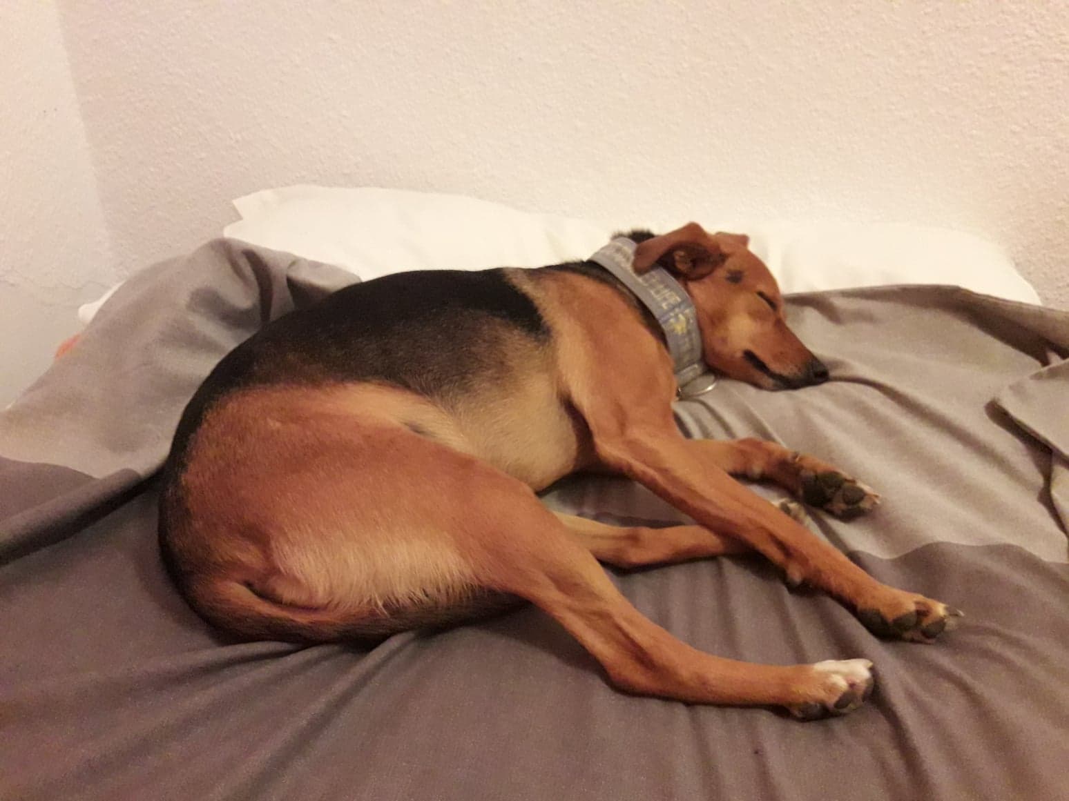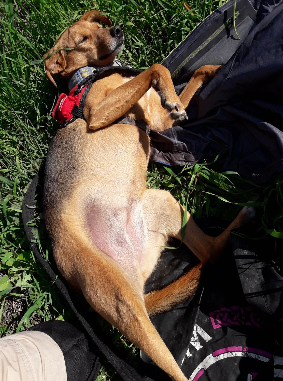 I found a vets and they were opening soon so we sat on the steps outside and waited. The vet was lovely, examining Chica thoroughly and to my relief saying it wasn’t anything to do with the caterpillars. She had a high temperature, however, and so it was probably an infection. He gave her an antibiotic injection and vitamins and asked me to bring her back in the morning. I then carried her, as well as my pack, to the nearest place I could camp and put her to bed wrapped in my fleece. She was instantly asleep.