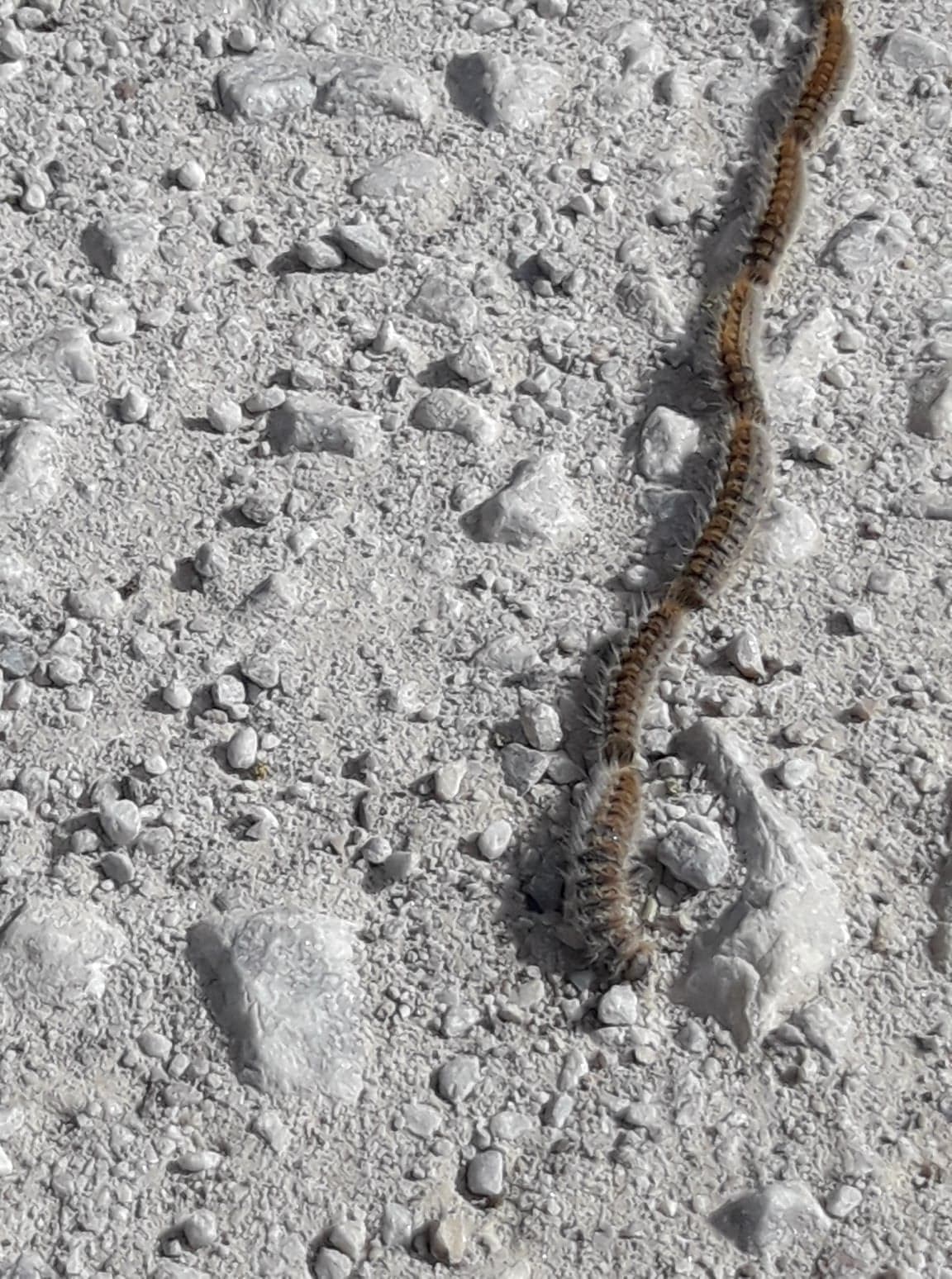 I woke as the sun hit the tent and Chica sat outside soaking up the warmth while I had a leisurely breakfast and packed up. It was 11ish before we set off up the track. More evidence of sap bleeding before we came across some processionary caterpillars on the march.