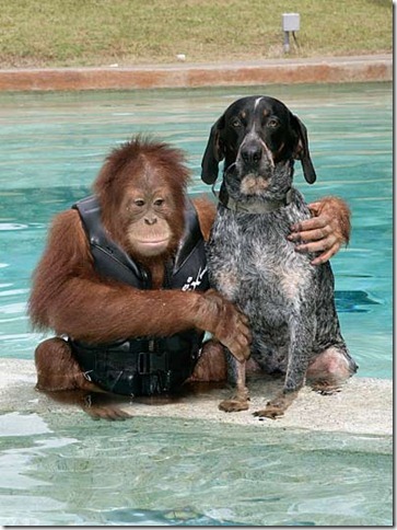 They live in Northern California where swimming is their favorite past time, although Roscoe (the orangutan) is a little afraid of the water and needs his friend’s help to swim.