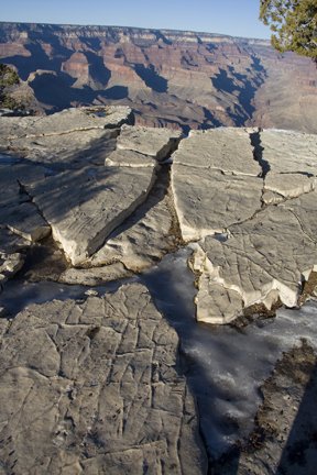 A layer of 230-million year old Kaibab Limestone caps the rim. The Grand Canyon reveals a 1.8-billion year glimpse into Earth’s past from views like these along the 1.2-mile-long Trail of Time, with displays of rocks from each of the two dozen rock layers in the mile-deep canyon. Photo by Pete Aleshire