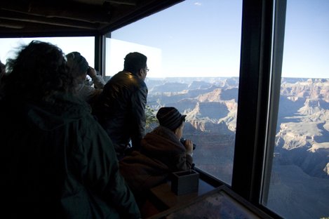 Visitors study the colorful layers of the Grand Canyon from the observation window in the geology museum at Yaqui Point. Photo by Pete Aleshire