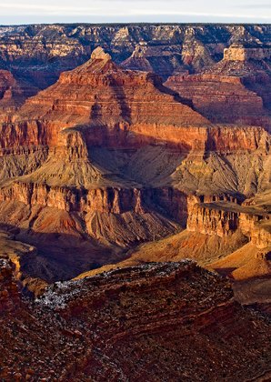 Farther down, the easily eroded Bright Angel Shale forms the shelf above the 1,800-foot-deep inner gorge. Shales form on shallow sea bottoms, compared to the deeper marine environments that create limestones. Most of the trails in the canyon run along its wide shelf. Formed 530 million years ago, the Bright Angel Shale represents the era when trilobites ruled the world.
