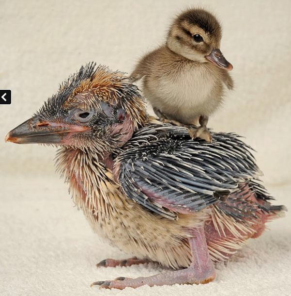This baby six-week old kookaburra called Kookie and a tiny duckling have struck up a friendship at the Seaview Wildlife Encounter, near Ryde in the Isle of Wight. Kookie was saved by staff after they feared his parents would kill him. And the duckling was rescued from one of the park’s aviaries because he was thought too small to defend himself against larger birds. Keepers took a chance and decided to see what would happen if they were put together. The duckling instantly cuddled up under Kookie’s protective wing, thinking he was his mum and Kookie didn’t seem to mind playing the caring parent