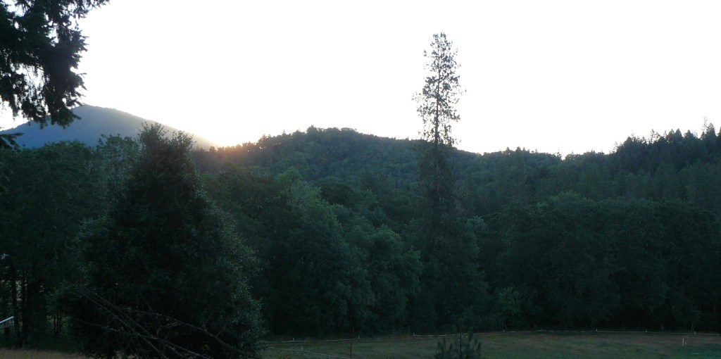 Walking back to the house, I stepped up on to the rear deck and looked up at the line where the tops of the forest trees on the hills to the East meet the morning sky. It was a clear, cloudless sky.