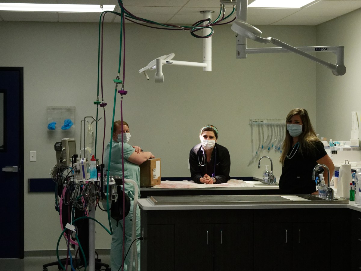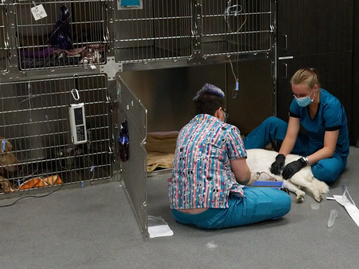 Another two staff attending to a dog.