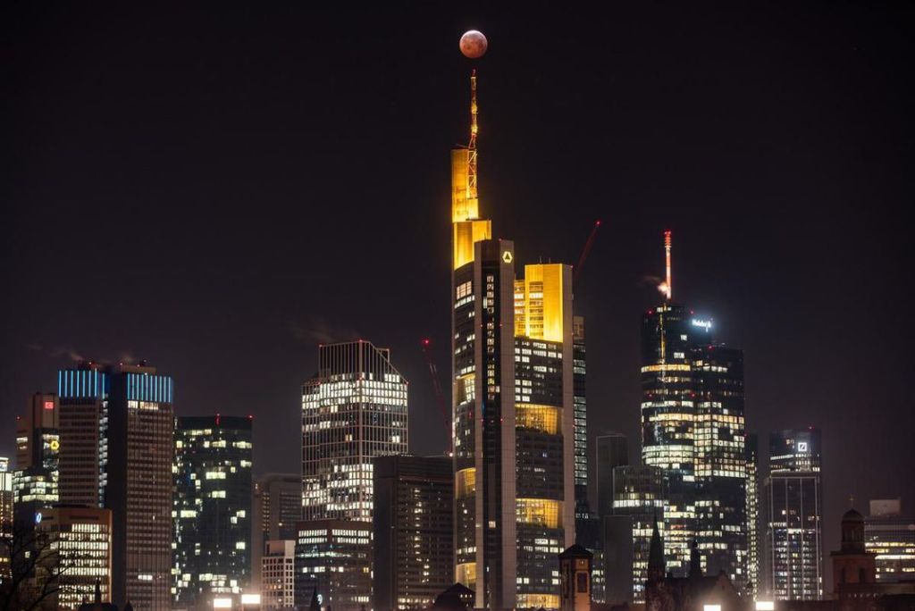 The moon during the January 21, 2019 total lunar eclipse over the skyline of Frankfurt. (Frank Rumpenhorst / Picture Alliance / Getty Images)
