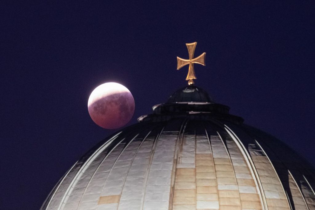 The lunar eclipse on January 21, 2019 before the moon is fully cast in shadow, hovering over the dome of the church St. Elisabeth in Nuremberg, Germany (Daniel Karmann/Picture Alliance/Getty Images)